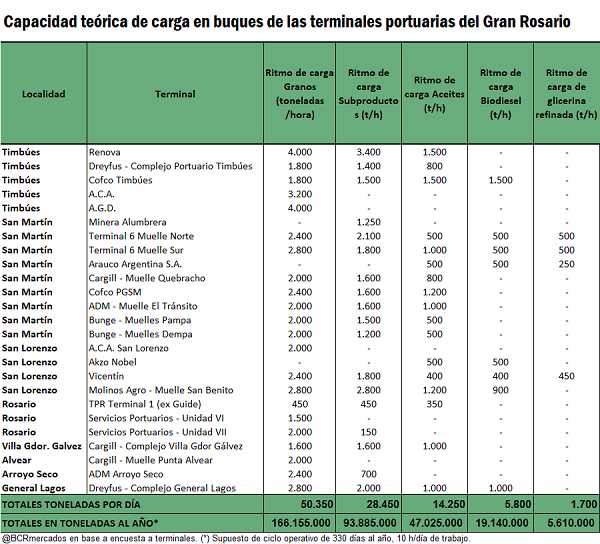 De las terminales relevadas, todas cuentan con capacidad para la carga de granos sin industrializar, salvo por las plantas de Arauco en Puerto General San Martín y la de Akzo Nobel en San Lorenzo, que se utilizan exclusivamente para la carga de aceite y biodiesel (en el caso de Arauco, también se emplea para la carga de glicerina refinada). En cuanto a la planta con mayor capacidad de carga de granos tenemos a la de Renova en Timbúes, con capacidad de carga de 4.000 toneladas por hora, compartiendo el primer lugar con la flamante planta de Aceitera General Deheza también ubicada en la localidad de Timbúes, que cuenta con una capacidad de carga similar. En total, se estima que se pueden cargar desde los puertos del aglomerado, 50.350 toneladas diarias de granos. Esto, realizando ciertos supuestos sobre el ritmo de operación de las plantas, nos da un total de 166 millones de toneladas de granos que pueden embarcarse anualmente desde el Gran Rosario.