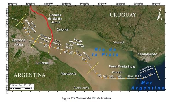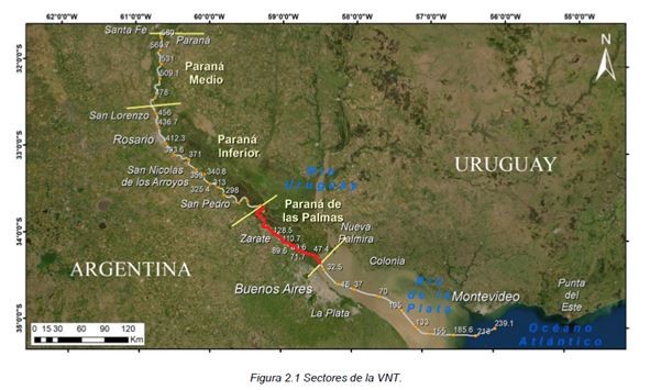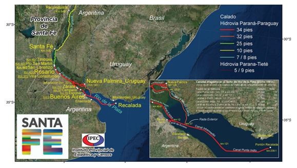 Debe de tenerse presente que, en la denominada “Traza fluvio-marítima” del Río Paraná, que va desde la Ciudad de Santa Fe al Océano, se distinguen dos tramos en cuanto a profundidades: el primero desde Ciudad de Santa Fe hasta Puerto General San Martín-Timbúes con un calado de diseño del canal troncal de 25 pies, y el otro desde Puerto General San Martín-Timbúes al océano, con un calado de diseño del canal navegable troncal del Río Paraná de 34 pies. Es necesario aclarar que este es el calado de diseño de la vía navegable, lo que no significa que sea el calado efectivo, que estará afectado por el nivel de las aguas en cada momento.