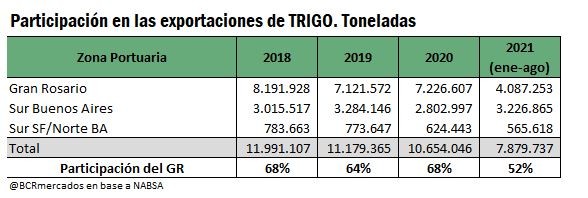 Como puede observarse en el cuadro, en el caso del maíz la participación cae desde la base del 80% que venía manteniendo en los tres años previos al 74% en lo que llevamos de 2021. Por el lado del trigo, más repartida su carga con los puertos del Sur de Buenos Aires, por la localización de la producción triguera nacional, la participación en el año 2021 cae a poco más de la mitad de los embarques totales.