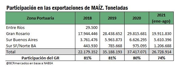 Podemos ver, sin embargo, como la participación en los embarques cae en 2021 en relación a los años previos. Esto se explica fundamentalmente por la anormal bajante del Río Paraná, que viene impactando con especial fuerza sobre las exportaciones argentinas: el hidrómetro ubicado en Rosario llegó a marcar durante agosto una altura de 33 centímetros por debajo del cero, en lo que fue el peor registro desde desde diciembre de 1970.
