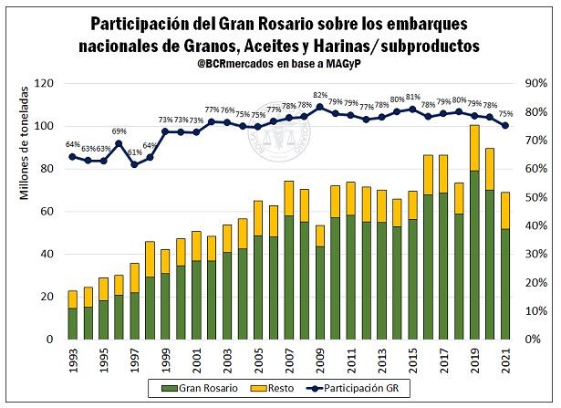 Desde los puertos del Gran Rosario salen hacia al mundo, en un año normal, aproximadamente el 80% de las exportaciones de granos, harinas y aceites de Argentina, participación que viene manteniéndose relativamente constante en la última década.