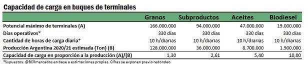 Así, suponiendo un régimen de trabajo de 10 horas diarias de estas terminales, en un ciclo operativo de 330 días al año, podemos estimar que desde los puertos de la región podrían embarcarse cerca de 166 Mt de granos, 94 Mt de subproductos, 47 Mt de aceite y 19 Mt de biodiesel. Si tomamos en cuenta los datos de producción para la campaña 2020/21, podemos estimar que desde las terminales del Gran Rosario podrían embarcarse 1,3 veces la producción nacional de granos, 2,6 veces la producción de subproductos, 5,4 la producción de aceites, y 10 veces la producción de biodiesel.