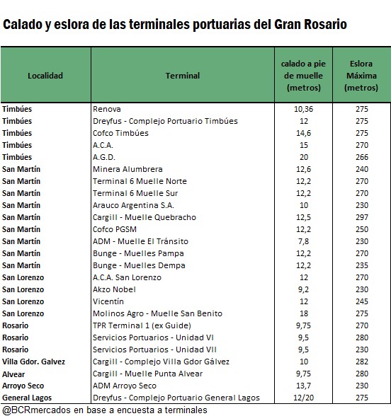 Por lo general, en condiciones normales, el calado de los puertos del Gran Rosario supera en su mayoría los 10 metros (33 pies) de profundidad, lo que permite el ingreso de buques graneleros de gran capacidad. Las terminales para las que, al momento de hacer el relevamiento, se informaron niveles normales por debajo de esta medida a pie de muelle fueron las de TPR Terminal 1 con 9,75 metros de calado, misma profundidad que la terminal de Cargill en Punta Alvear; la terminal “El Tránsito”, propiedad de ADM en Puerto General San Martín con 7,8 metros de calado, y la de AKZO Nobel en San Lorenzo, con 9,20 metros.