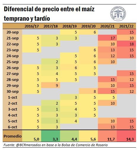 Tomando el período entre fines de septiembre y principios de octubre para las últimas cinco campañas, el diferencial promedio entre los precios ofrecidos para la nueva campaña se ubicó en US$ 14,3 /t, superando la brecha promedio del año pasado. Además, otro aspecto remarcable es que, en años anteriores, cuando la situación climática se mostraba favorable al momento de las siembras y no eran muchos los productores que se decantaban por sembrar maíces tardíos, el diferencial de precio se ubicaba considerablemente por debajo de sus valores actuales.