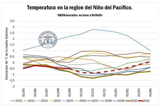 De todas maneras, al menos en principio, la intensidad del fenómeno Niña de los próximos meses sería moderada. En el siguiente gráfico puede observarse la evolución de la temperatura de la superficie del Océano Pacífico en la mencionada región. Tal como se puede apreciar, en agosto y septiembre, la temperatura de la superficie del agua en esa región del Pacífico se ubicó por encima de los registros del año 2020. Asimismo, las proyecciones para los meses que vienen también dan cuenta de que la intensidad del fenómeno no sería tan marcada.