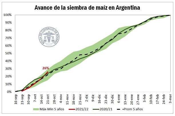 El maíz 2021/22 se encamina a ser la gran estrella de la nueva campaña. Con un crecimiento del área de más del 7% respecto de la campaña actual, las primeras proyecciones vislumbran una producción récord de más de 56 Mt. Frente a estas expectativas, ya se ha lanzado la siembra del temprano en gran parte del territorio nacional, habiéndose cubierto el 26% del área de intención de siembra. Además, en la última semana se intensificaron las labores y se superó tanto el ritmo de la campaña previa como el del promedio del último lustro.