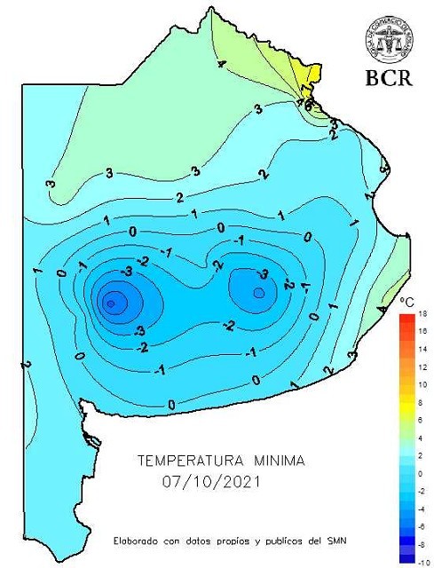 En la madrugada del jueves (7/10), el reciente ingreso de aire muy frío desde el sur hacia la región central provocó un fuerte descenso térmico y heladas generalizadas en Buenos Aires. El registro más bajo fue el de Coronel Suarez con -6°C. Les sigue Tandil con -4°C, y Azul con -2,8°C.