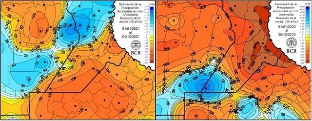 En rojo: entre el 2020 y lo que va del 2021 faltan 300 mm en la región