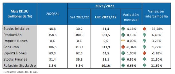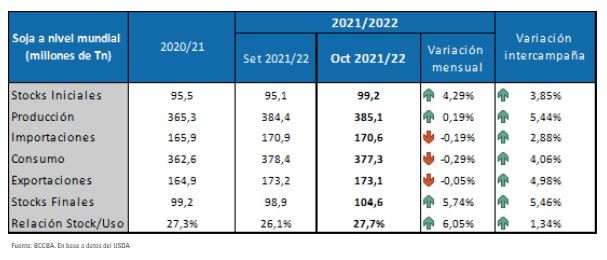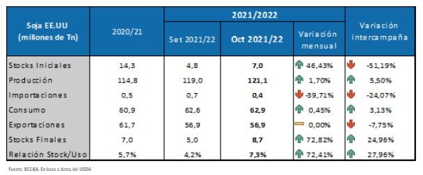 En cuanto a la cosecha en Estados Unidos, se ubica en 44,8 millones de toneladas, 1,4 millones de toneladas por debajo del reporte de septiembre. Las existencias finales, por su parte, serían de 15,8 millones de toneladas, cuando el mercado esperaba 15,7 millones de toneladas.