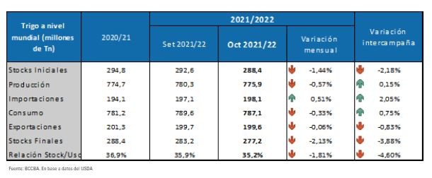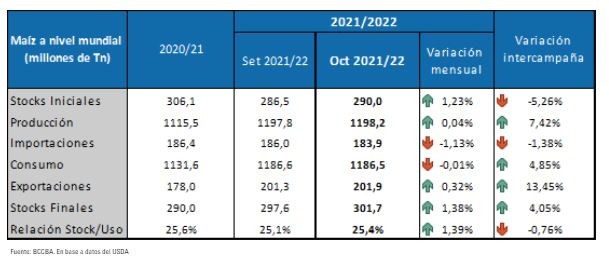 En el mundo, se proyecta una producción récord de 1198,2 millones de toneladas y stocks finales de 301,7 millones de toneladas. Las existencias aumentan 4,1 millones de toneladas respecto al reporte anterior y se ubican por encima de lo esperado por los privados (298,8 millones de toneladas).