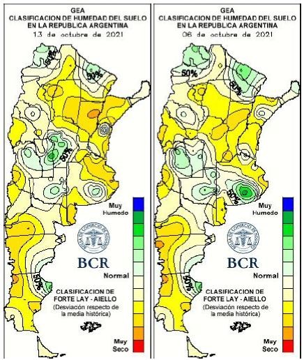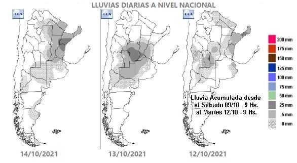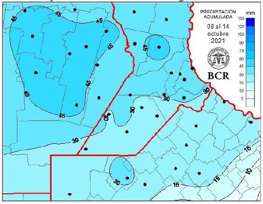 Los pronósticos era muy pesimistas para las lluvias del 12 al 14 de octubre: solo un modelo daba la posibilidad de recibir más de 20 mm. Las tormentas de esta última semana dejaron mucho más agua de la que se esperaba: el 55% de la Región Núcleo acumuló más de 30 mm. Y al contrario de lo que venía ocurriendo, la franja oeste de la región núcleo recibió los mayores acumulados: en el sudeste de Córdoba Idiazabal, Bengolea y Hernando acumularon 58 mm, Canals, 53 mm. En Santa Fe, Classon recibió 52 mm y Montes de Oca, 42 mm. Hacia el sur de la región los milimetrajes disminuyen. En el norte bonaerense, General Pinto registro 34 mm y Ramallo 25 mm. Rojas quedó con 15 mm. Fueron más que oportunas para los trigos, llegaron tarde para completar la siembra de los maíces tempranos, pero impulsarán la siembra de soja en los próximos días.