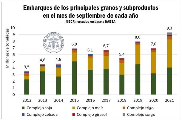 En cuanto al resto de los complejos incluidos en el análisis, se destacan los embarques de sorgo, que alcanzaron en septiembre 396.000 toneladas, casi siete veces más que en el 2020 y también marcando un récord histórico para ese mes. Por último, los complejos trigo, cebada y girasol se apuntaron con 450.000, 90.000 y 97.000 toneladas, respectivamente.