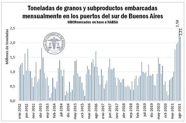 Este elevado volumen se explica principalmente por los mayores despachos de maíz y de productos del complejo soja. Los embarques de granos amarillos totalizaron 4,2 Mt, levemente por debajo de los embarques de agosto, pero un 31% más que en septiembre de 2020 y un máximo histórico para el mes.