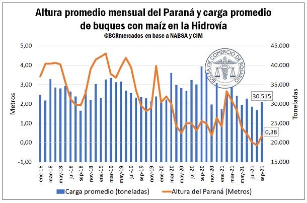 De hecho, tal como el mes pasado se comentó que la bajante había llevado las cargas promedio de los buques de maíz a mínimos en tres años, esto se revirtió en septiembre y la carga promedio se ubicó en 30.500 t, casi 2.000 t más que en el mes anterior.
