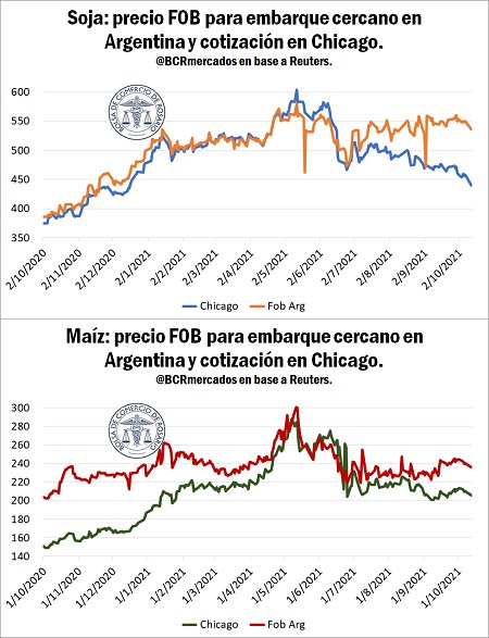 Otro tanto ocurre con el maíz. Si bien el futuro con vencimiento más cercano cerró el martes en US$ 205 /t, el precio FOB para embarque próximo en Argentina se ubicó el mismo día en US$ 236 /t. Además, desde el pico registrado en mayo, el precio FOB retrocedió 25%, mientras que el precio en Chicago cayó 31%.