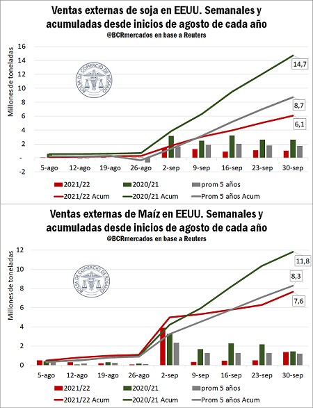 Respecto a la demanda, el USDA inicialmente previó que la demanda global tanto de soja como de maíz se sostenga en la nueva campaña, dándole sostén a los precios. Sin embargo, viendo las ventas externas tanto de soja como de maíz de la nueva campaña desde inicios de agosto a la fecha, se observa que en ambos casos las ventas se ubican considerablemente por debajo de los volúmenes de hace un año. Para el caso de la soja, desde la semana del 5 de agosto a la fecha, las ventas externas acumulan algo más de 6 Mt, menos de la mitad de las 14 Mt que se vendieron entre agosto y septiembre de 2020. Por el lado del maíz, en tanto, las ventas externas en ese período totalizan 7,6 Mt mientras que el año pasado en igual lapso se registraban negocios por casi 12 Mt.