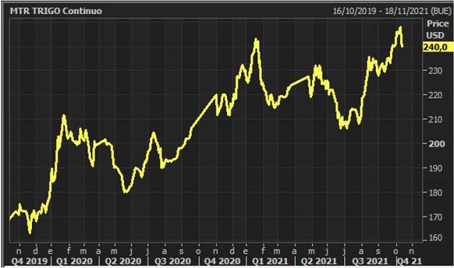Veamos la evolución de los precios del trigo en el mercado local (Matba-rofex) de los últimos 2 años: