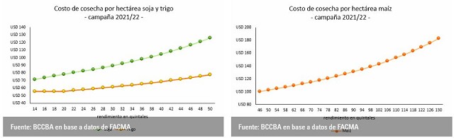 El servicio de cosecha consta de diferentes cotizaciones, dependiendo del cultivo y su rendimiento en la hectárea a cosechar. Para la campaña 2021/22 se espera un costo de USD 97/ha para la soja, USD 133 /ha para el maíz, y USD 64 /ha para el trigo, considerando los rendimientos promedio de 30 qq/ha, 78 qq/ha y 28 qq/ha, respectivamente. La curva de la cotización en el servicio de cosecha puede observarse en los siguientes dos gráficos: