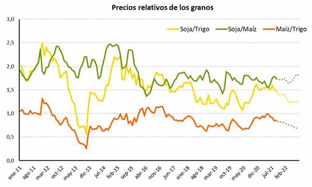 Respecto a los pecios relativos entre los granos, desde fines de 2015 en adelante hubo un reacomodamiento de los precios internos para reflejar los cambios en los derechos de exportación, que favoreció especialmente al maíz. En este sentido, desde enero de 2011 hasta diciembre de 2015, la relación del precio soja/maíz, es decir, cuántas toneladas de maíz podría adquirir al vender una tonelada de soja en el mercado disponible, se ubicó en un promedio de 2,1 toneladas. Por otro lado, desde enero de 2016 hasta septiembre de este año, la relación disminuyó y se situó en un promedio de 1,7 toneladas de maíz por cada tonelada de soja, reflejando el incremento de valor del cereal respecto a la oleaginosa. Para mayo de 2022 se espera que esta relación se ubique en exactamente 1,7, con pocas fluctuaciones en los meses anteriores.