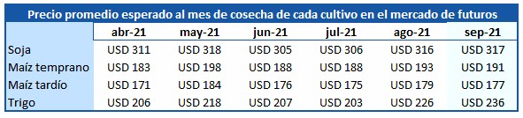 La perspectiva hacia el precio de los cultivos se mantuvo alta durante la mayor parte del año, con un retroceso en los meses de junio y julio debido a las mejores perspectivas de la cosecha de Estados Unidos y las posibles reformas a las mezclas de combustibles en el mismo país, entre otras causas, pero nuevamente tomaron fuerza en agosto y septiembre. Para los próximos meses el mercado espera una evolución bajista para la soja y el maíz, aunque aguarda un futuro prometedor para el trigo. Mirando hacia el mes de cosecha se esperan precios de USD 236/tn para el trigo, USD 317/tn para la soja, USD 191/tn para el maíz temprano y USD 177/tn para su variante tardía. Estos precios se mantienen entre el 10% y el 24% por encima de su promedio en los últimos diez años, especialmente el trigo y el maíz.