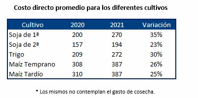 De todas formas, no todos los cultivos se siembran en el mismo período, y el precio de los insumos varía para cada uno. En la tabla siguiente se muestra el cambio en el costo directo (excluído el costo de cosecha), considerando el precio de mayo para el trigo, y el del último mes disponible para los demás cultivos, cuya siembra aún no se ha realizado.