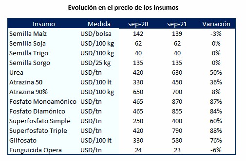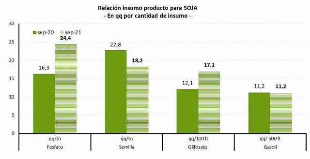La relación insumo producto incrementó para la soja, el maíz y el trigo respecto al valor de la campaña previa. Los incrementos fueron del 7,7%, 7,6% y 2,1% respectivamente. Esto implica que, si bien el precio de los cultivos subió notablemente en un año, el aumento del precio de los insumos superó este crecimiento, provocando un mayor requerimiento de granos para adquirir la misma canasta de productos.
