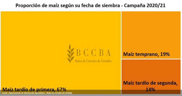 A inicios de octubre el contenido de agua en el suelo a 1 metro de profundidad reflejaba un perfil de humedad subóptimo para la siembra de los cultivos tempranos y bajo condiciones de La Niña, motivo por el cual gran parte del sector agrícola en Córdoba tomó la decisión de ir hacia una siembra tardía. Particularmente en el caso del maíz esta situación llevó a un importante descenso en la proporción temprana y a un avance de siembra por debajo del promedio histórico, llegando a valores cercanos a los mínimos. La proporción de siembras tempranas fue del 19 %, cuando en una campaña normal esta participación es de alrededor de un tercio del total.
