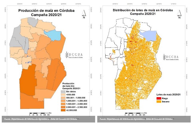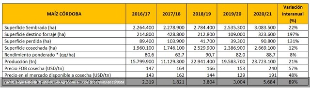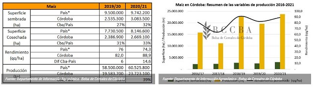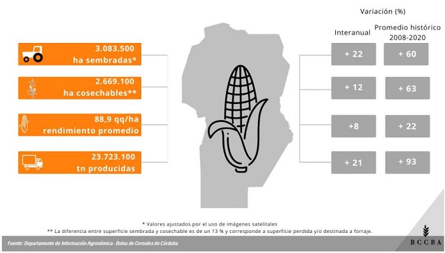 Durante la campaña 2020/21 se produjeron 23.723.100 toneladas de maíz. Este valor representa un aumento del 21 % con respecto a la campaña 2019/20 y un 93 % con respecto al promedio histórico (2008-2020). La principal causa de este aumento es el importante crecimiento en el área sembrada, que en esta campaña superó por primera vez en la historia las 3 millones de hectáreas, alcanzando 3.083.500 ha al sumar la superficie en secano y bajo riego. Debe destacarse que el 11 % del área se sembró con destino forrajero.