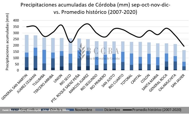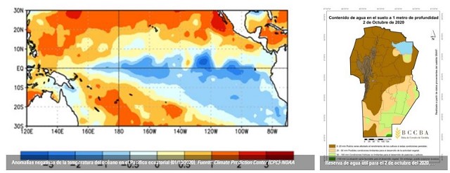Al analizar la temperatura superficial del mar en el océano Pacífico ecuatorial, a inicios de la primavera en el hemisferio sur en el año 2020, se observaron anomalías negativas, lo que marcó el inicio de condiciones climáticas de La Niña, evento que se mantuvo hasta el mes de marzo. El efecto de La Niña en la provincia de Córdoba causa precipitaciones por debajo de la media.