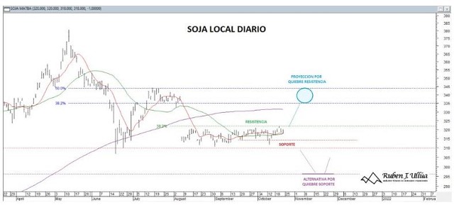 Mas allá de la firmeza que ha mostrado el contrato próximo a vencer de noviembre/21, con precios que alcanzaron instancias de 360-362 dólares, haciendo un enfoque a lo que viene para el nuevo ciclo 21/22, observamos que el precio de la soja mayo/22 se ha logrado estabilizar en el rango de 310-322 dólares.