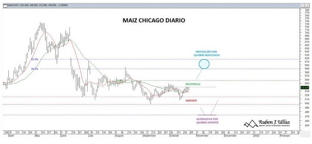 Creemos que las instancias de mínimos alcanzada de 500-470 centavos representan un importante soporte de la baja del cereal. Mientras esta zona no sea quebrada ante nuevas debilidades, estaremos expectantes de recuperaciones parciales mayores a la baja sufrida en los últimos meses.