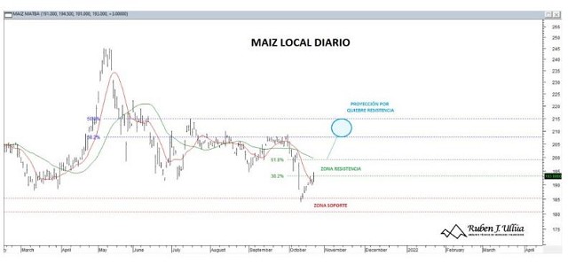 En este sentido, lo primero que debemos saber es que la zona de mínimo conseguida en 185-180 dólares es principal soporte a cuidar. Mientras esta zona no sea vulnerada a la baja, las expectativas se inclinarán por una recuperación parcial mayor en el precio del cereal. La zona actual de 193-200 dólares es principal resistencia a la recuperación en curso. Estaremos atentos ante subidas por encima de esta zona, ya que ello estará indicando que el piso buscado ha sido conseguido y que una recuperación mayor para este contrato ha quedado habilitada, con posibilidades de un acceso de los precios en las próximas semanas o meses hacia la zona de 207-215 dólares.