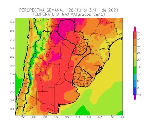 El este del NOA, la mayor parte de la Región del Chaco, el este de Cuyo, el sudoeste de Corrientes, la mayor parte de la Región Pampeana y el centro del Paraguay observarán temperaturas máximas superiores a 35°C, con focos de más de 40°C y otros focos con valores inferiores.