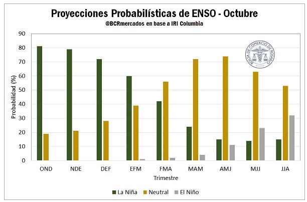 Sin embargo, al igual que el ciclo previo, las condiciones climáticas han generado cierta incertidumbre en los productores, debido a la ausencia de precipitaciones en amplias zonas productivas, particularmente del norte del país. Además, de acuerdo con lo publicado por el International Research Institute de Columbia, la probabilidad de que ocurra un evento Niña en los trimestres oct-nov-dic y dic-nov-ene es del 81% y 79% respectivamente, para luego ir disminuyendo con el correr de los meses y retornar a una situación neutral.
