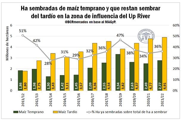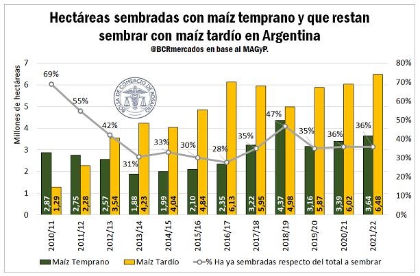 Ante este panorama (que es muy similar al que ocurría hace un año) y teniendo en cuenta que en la campaña 2020/21 los maíces tardíos lograron rindes más consistentes que los tempranos al recibir una mayor cantidad de agua en períodos críticos, muchos de los productores han pospuesto las siembras. Esto ha desembocado en una mayor superficie sembrada con maíces del segmento tardío. De hecho, a nivel país, la superficie que se sembrará con este segmento alcanza un récord histórico con 6,48 Mha, superando el récord previo de la 2016/17, cuando 6,12 Mha fueron destinadas a este segmento.