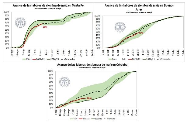 En cuanto a Córdoba, que el año pasado había sembrado la menor superficie con maíz temprano consecuencia de la falta de agua, este año lleva implantado el 26% de la superficie total, equivalente a 800.000 ha. De todas maneras, el avance de las labores se encuentra considerablemente por debajo del promedio del último lustro (35%).