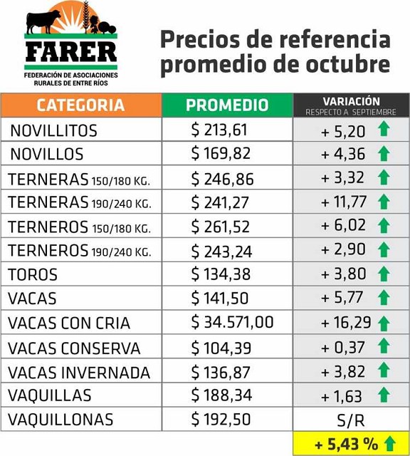La Federación de Asociaciones Rurales de Entre Ríos (FARER) dio a conocer los datos mensuales en relación a los precios de referencia del ganado vacuno, cuyos valores son obtenidos por las firmas consignatarias que realizan sus remates en las distintas sociedades rurales de la provincia.