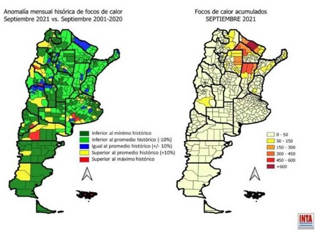 Por el contrario, departamentos como Florentino Ameghino o Coronel Suarez en Buenos Aires, o bien 25 de Mayo en San Juan, o Picun Leufu en Neuquén acumularon pocos focos de calor (menos de 20), pero la cantidad registrada fue superior al máximo histórico registrado en cada uno de ellos para septiembre considerando la serie histórica 2001-2020.