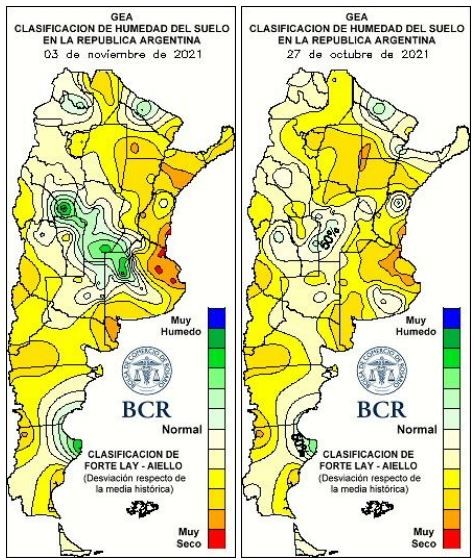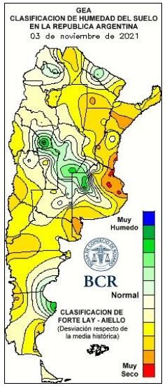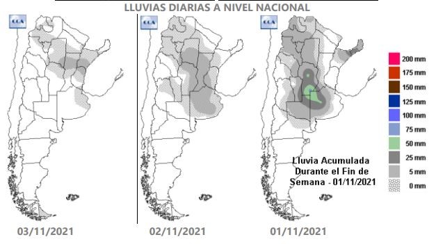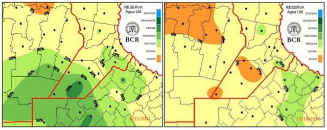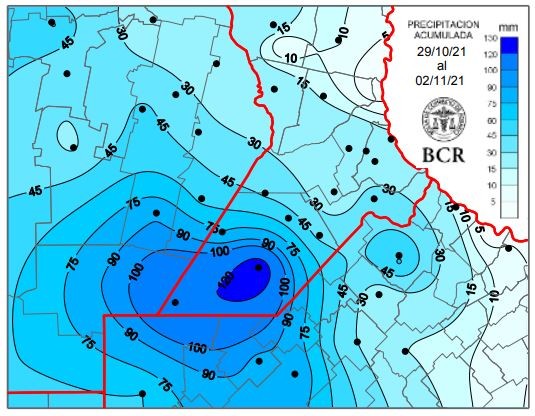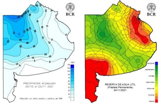 Los fenómenos de “tiempo extremo (severe weather)” volvieron a expresarse a pleno. Pero esta vez a favor de Argentina, porque si bien las lluvias cumplieron con la distribución que los modelos pronosticaban, no se esperaban montos de ésta magnitud. En el S de Córdoba, SE de Santa Fe, NO de Buenos Aires y NE de La Pampa hubo registros que superaron o estuvieron muy cerca de los 100 mm, cuando se esperaba menos de 20 mm. Si bien hace una semana Elorriaga decía: “la transición a noviembre muestra condiciones muy parecidas a las que se dieron antes de las importantes lluvias de inicios de setiembre” por lo que podía esperarse alguna sorpresa favorable, lo que sucedió superó por lejos las expectativas. El epicentro de las tormentas estuvo en el sur de Santa Fe con María Teresa registrando 136 mm entre los días 29/10 al 3/11. Córdoba es la provincia más favorecida por este evento: el 70% de su territorio recibió más de 30 mm, con el sur y centro oeste provincial superando las marcas de los 45 mm. En Santa Fe fue más acotado, sólo el 20% de la provincia superó los 30 mm. El dato destacado está en el sur santafesino: el departamento General López, que venía arrastrando una enorme deuda de milímitros, recibió esta vez más de 50 mm. La Pampa tambien recibió importantes registros en el NE con más de 30 mm en el 17% de su área.