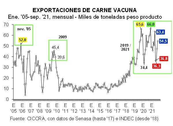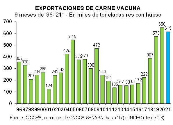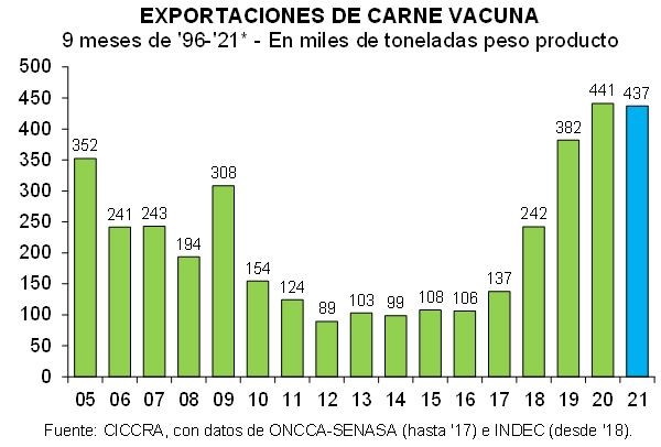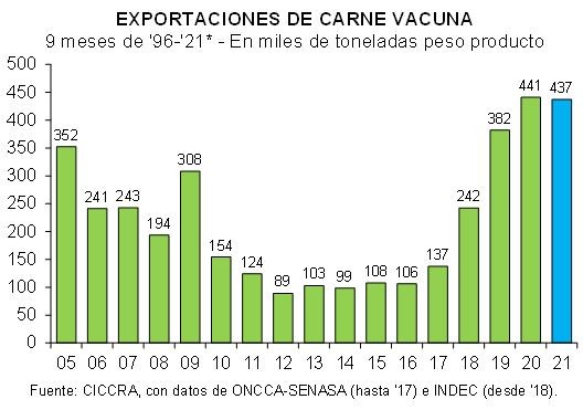 En enero-septiembre de 2021 se exportó un total de 437,1 mil tn pp de carne vacuna, volumen que resultó similar al exportado en los primeros nueve meses del año pasado, pero al medirlas en toneladas r/c/h equivalentes, se observó una caída de 5,4% anual.