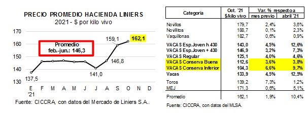 En consecuencia, en el acumulado de abril-octubre de 2021 el valor de la hacienda en pie aumentó 10,4%. Las vacas ya recuperaron todo el valor perdido, siendo la categoría que mayor suba registró entre abril y octubre (12,5%). Todas las categorías de vacas recuperaron sus valores. Los MEJ registraron un aumento de 5,1% en seis meses, los novillos otro de 3,6% y los novillitos otro de 2,3%. En los casos de los toros y vaquillonas, los aumentos fueron de 1,2% y 0,9%.