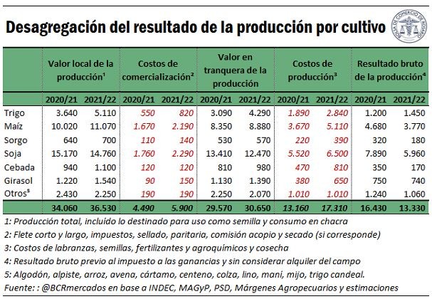 Resulta evidente que, a pesar de que el valor local de la producción para la nueva campaña podría llegar a ser el más elevado de la historia por los buenos precios y la perspectiva de una recomposición en los volúmenes, los elevados costos de producción que deberá afrontar el productor en la nueva campaña repercutirán considerablemente sobre su resultado económico y éste caería respecto de la 2020/21.
