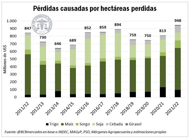 En la nueva campaña, en base a las estimaciones de área sembrada y las proyecciones área cosechada de cada cultivo y en base a los costos de producción, se estiman que las pérdidas por hectáreas que quedarán sin cosechar podrían llegar a ascender a US$ 948 millones, un máximo histórico. Esto ocurre a pesar de que se proyecta que las hectáreas perdidas entre los seis principales cultivos sean prácticamente idénticas al ciclo 2020/21. La razón de ser de este fenómeno se encuentra en los elevados costos de producción estimados para la nueva campaña.