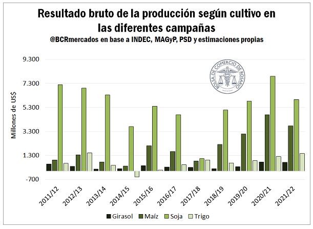 Por otro lado, viendo la evolución del resultado bruto de la producción de cada cultivo en las últimas 10 campañas, podemos observar que, si bien la soja se mantiene como el principal cultivo, fue perdiendo participación con el correr de los años.