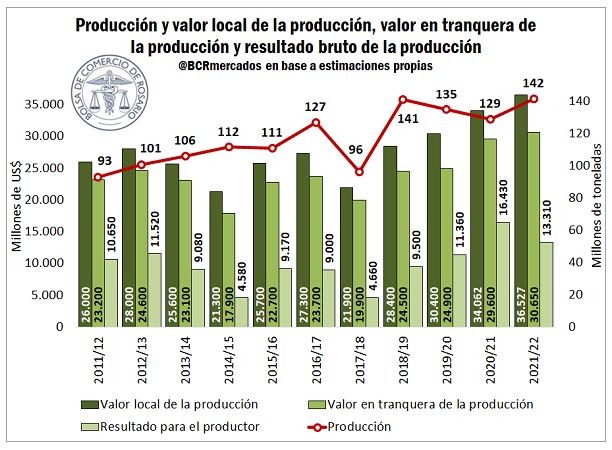 De esta manera, el resultado bruto de la producción previo al impuesto a las ganancias y al pago del alquiler del campo asciende a US$ 13.330 millones, una caída de 19% respecto del resultado obtenido en la campaña 2020/21.