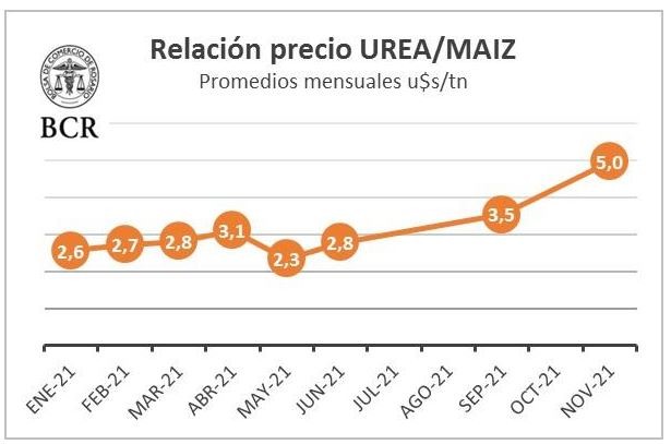 Al relacionar el precio de la tonelada de urea con el precio de la tonelada del grano de maíz sembrado en diciembre, el índice insumo/producto presento una suba de 1,5 puntos respecto a septiembre de este año. Este incremento es explicado por el salto que se dio en el precio del fertilizante, 40% superior a dos meses atrás. Es decir, se necesita producir más maíz para cubrir este costo de producción.