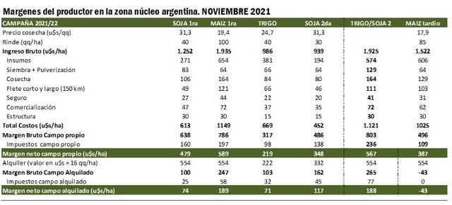La condición “campo alquilado” es donde se dieron las mayores variaciones porcentuales negativas. Al igual que en septiembre, la soja de primera volvió a caer en campo alquilado con un 31% de variación negativa. Le sigue el trigo con -30%. Esto se refleja en la caída del 23% en la rentabilidad de la rotación trigo-soja2da bajo alquiler. El maíz temprano cayó también con los aumentos en los costos de fertilizantes e insumos, pero sique encabezando los resultados. Tanto en campo propio como en arrendado, presentó los mejores números por hectárea, 589 u$s y 189 u$s respectivamente.