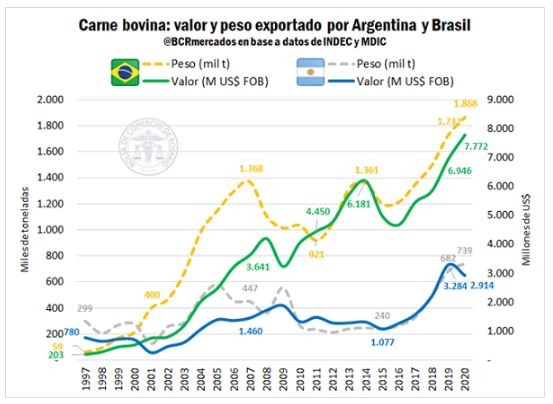 En 1991, Argentina disolvió la Junta Nacional de Carnes, eliminándose las restricciones y retenciones a la exportación. Hacia finales de la década se dio por erradicada la aftosa, hecho que permitió la reapertura de los mercados internacionales para la carne argentina. En 1997, año de inicio de la serie de tiempo graficada, Argentina exportaba 299.000 toneladas de carne bovina (por un valor de US$ 780 millones FOB). Es decir, despachaba 5 veces las exportaciones de Brasil obteniendo un valor FOB casi 4 veces al logrado por el país vecino.