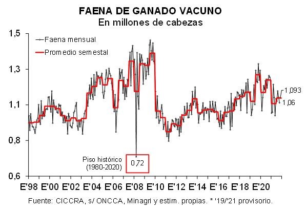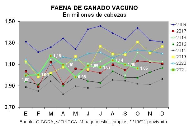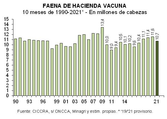 En el acumulado de los primeros diez meses de 2021 se faenó un total de 10,72 millones de cabezas de hacienda vacuna. Este número resultó 7,5% menor al de enero-octubre de 2020 (-9,5% cuando se ajusta por el número de días laborables).