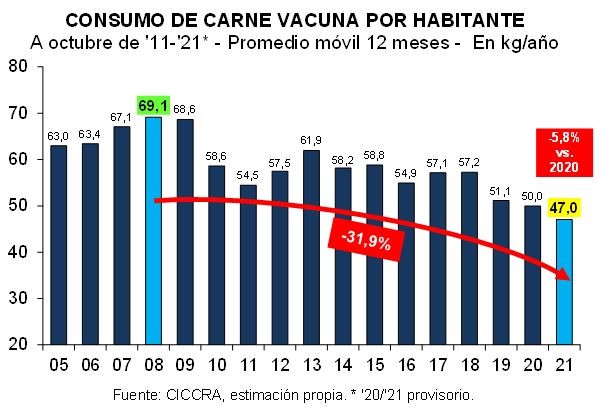 En octubre de 2021 el consumo aparente de carne vacuna equivalió a 47,0 kg/año, medido como el promedio de los últimos doce meses (noviembre 2020-octubre 2021). En términos interanuales se observó una caída de 5,8% (-2,91 kg/hab/año).